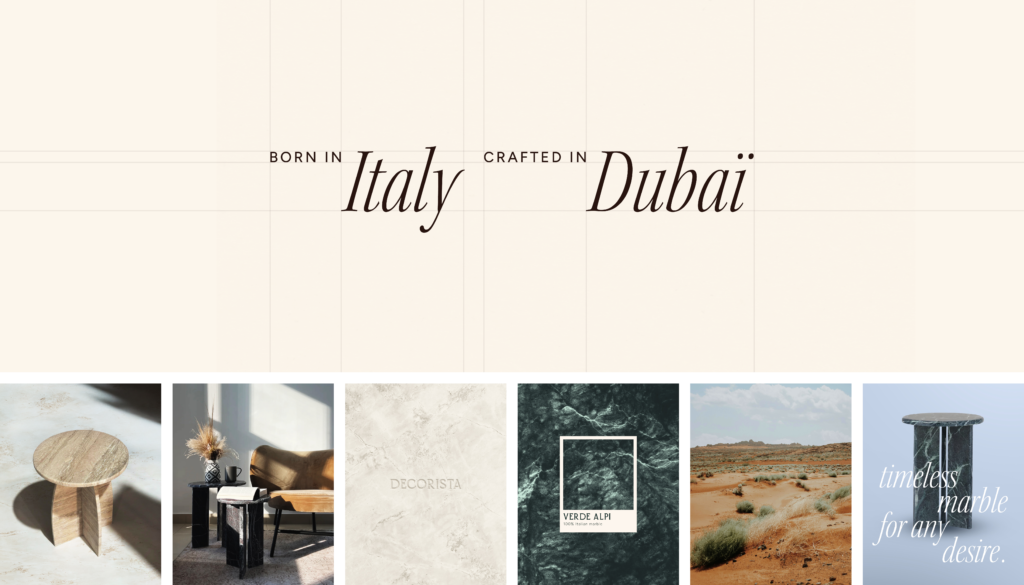 refonte de l’identité visuelle d’une marque de design d’intérieur basée aux Émirats arabes unis, confectionnant des pièces en marbre italien recyclé
